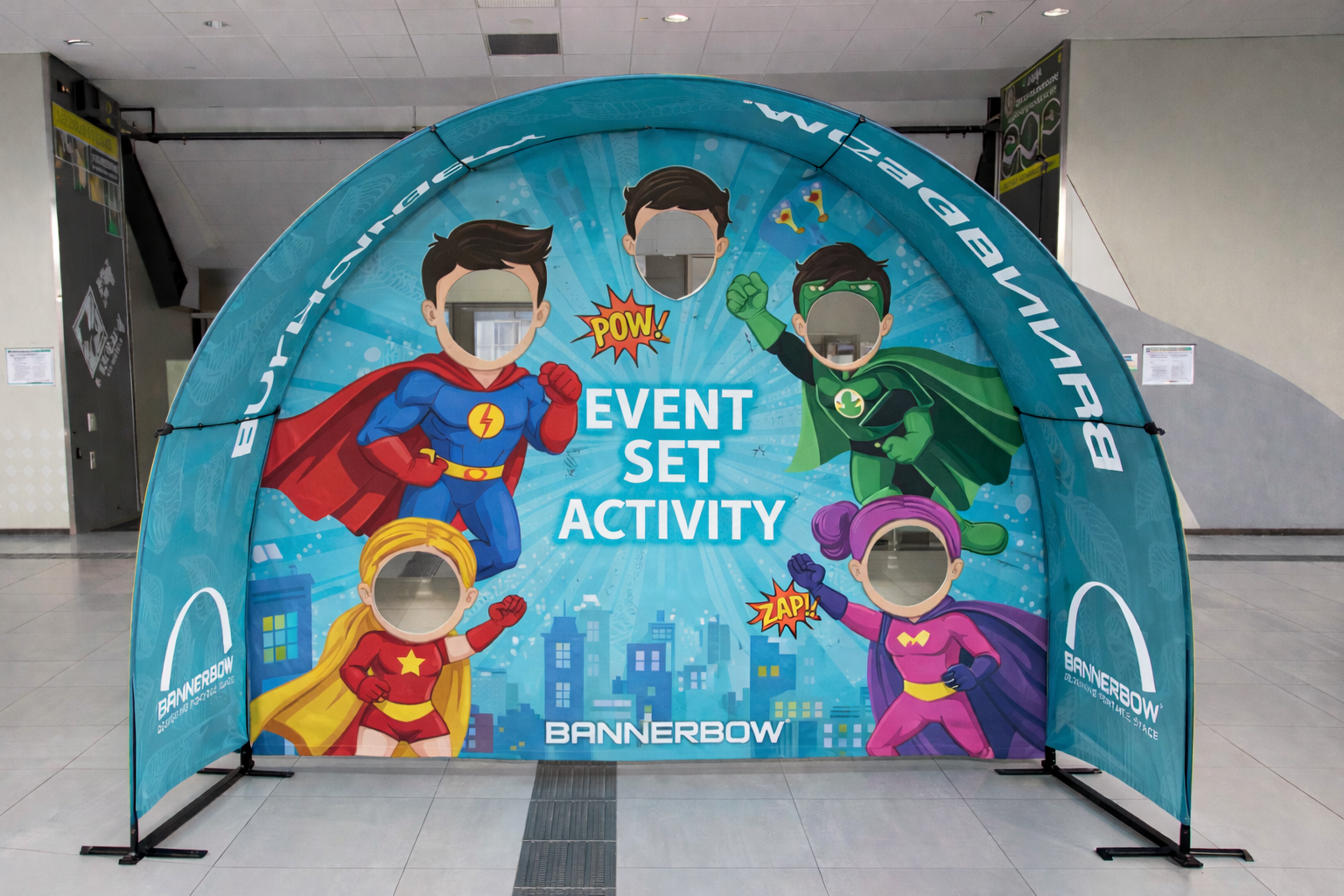 The cut-out design also allows for creative photo opportunities, where children – and adults – can step into the backdrop and become part of the visual experience. A versatile solution that combines branding, activity, and entertainment in one compact event setup.